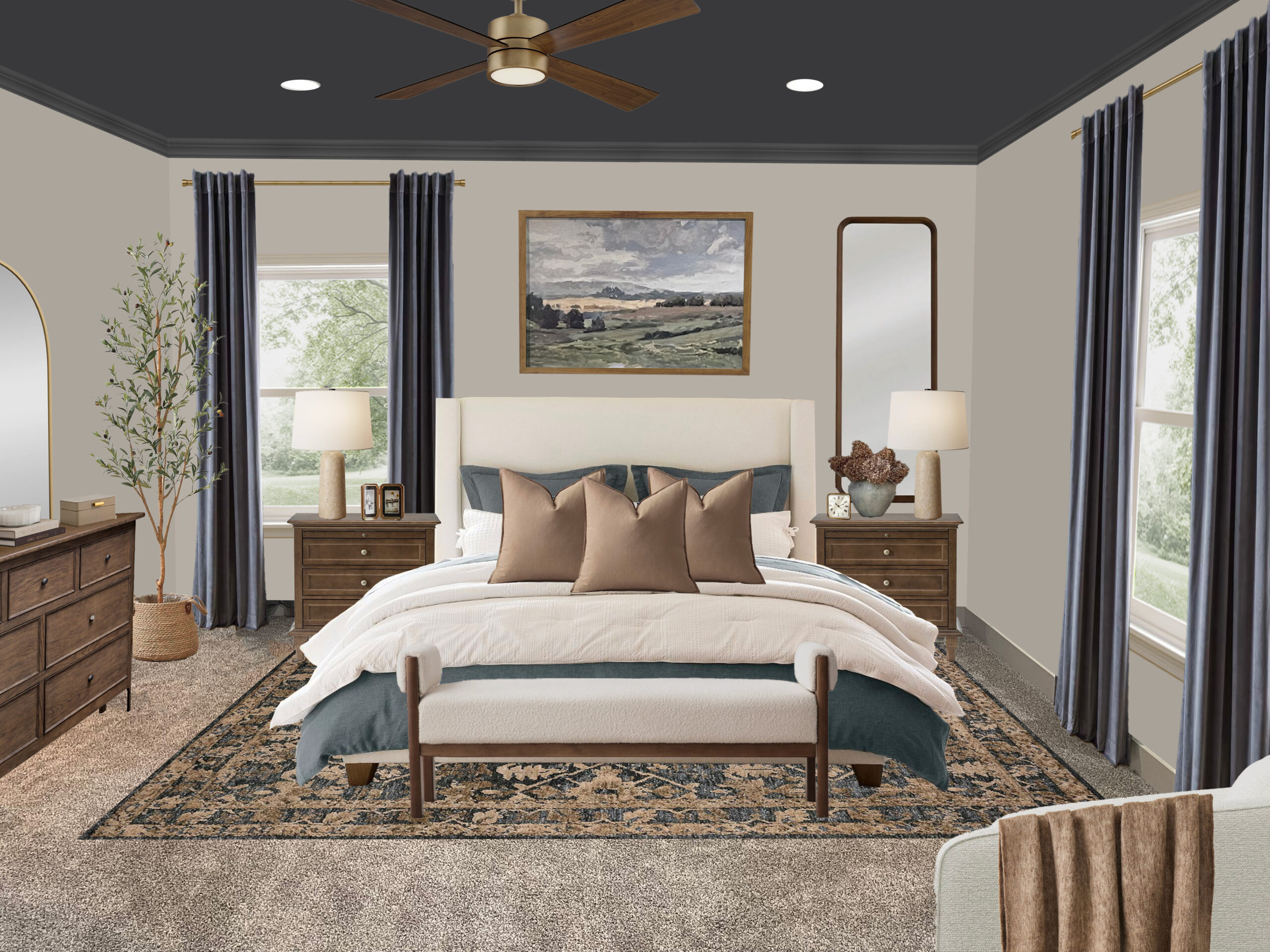 Keeping the existing bed, I added a moody, deep-colored rug to ground the space and tie in the colors from the artwork. I swapped the cubbies for a warmer, more sophisticated dresser with coordinating nightstands. The navy curtains were a good start; I simply hung them higher and added a gold curtain rod. With the richly colored rug and the navy curtains, I kept the walls neutral, added crown molding, and drenched the ceiling and molding in a moody navy tone.