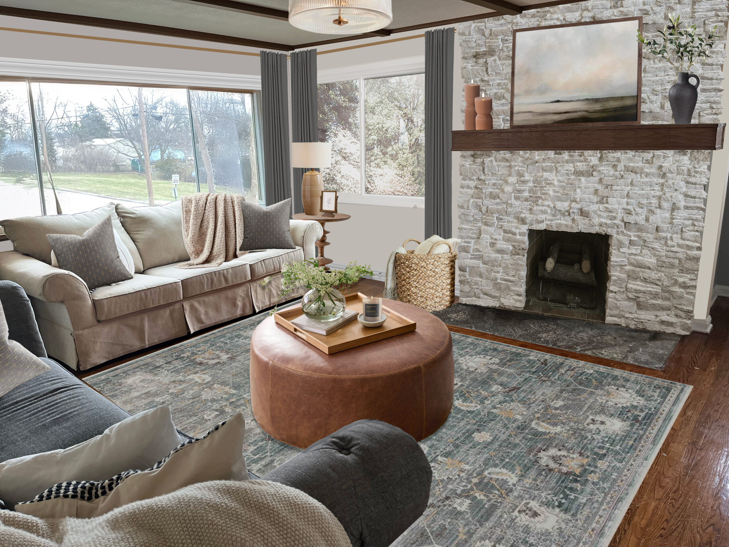Moving to the window, I would remove the blinds, as they make the space feel dated. I added gray-blue curtains that hang close to the ceiling to help the room feel taller. The current rug is too small for the space, and a larger rug helps ground the room. I also swapped the wood coffee table for a soft ottoman to enhance the cozy feel.