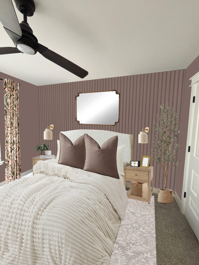 Alternative Option 2: Still keeping the slatwall to add texture and depth to the space, but instead of black I opted to color drenching the room with this beautiful mauve color (Cinnamon Slate by Sherwin Williams). This version feels more feminine and delicate and really allows the furniture to be the focal point of the room. The key to creating a room that feels really dynamic is to add a lot of layers. Starting with the slatwall, there’s a lot of texture and visual interest, then adding in substantial furniture that fits the space, and then finishing the space with an area rug, curtains, and bedding that all fit within the same color pallette but introduce lots of different patterns for that cozy, designer look.