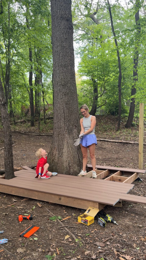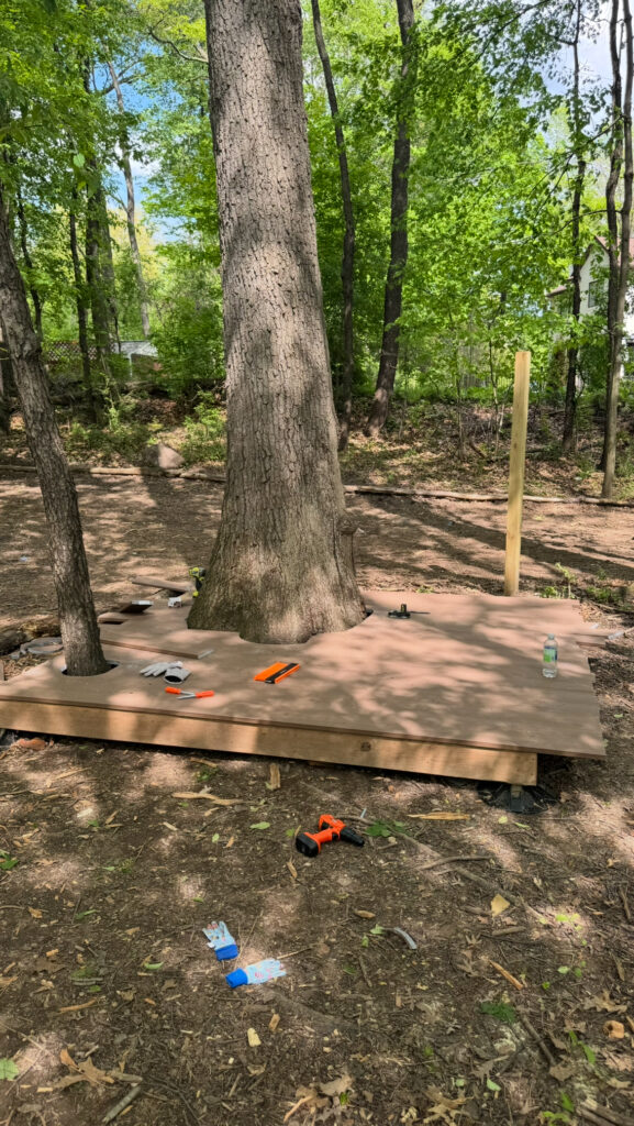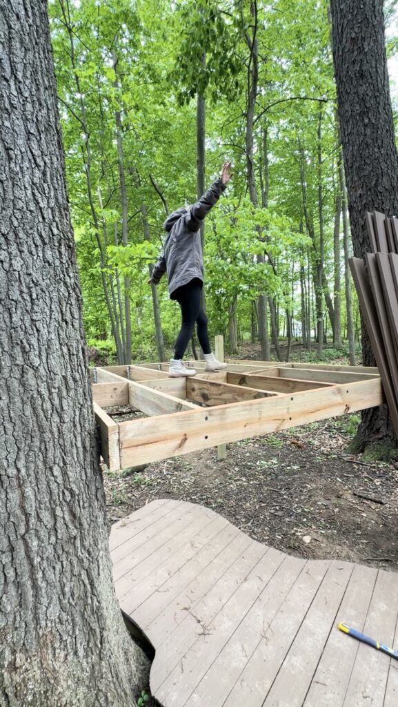 Once the cement was dry, I was ready to start building the lower platform. It’s a floating platform that the kids can have a table and chairs on below the treehouse. This was a good place to start because its only a few inches off the ground and built up my confidence before building a whole house and putting it in a tree. I used 2x6s to build the frame and joists and composite decking for the top. I cut the decking around the tree, making sure to leave a big enough gap for the tree to grow and move. Then I cut a curved pattern on the edge to give a whimsical vibe.