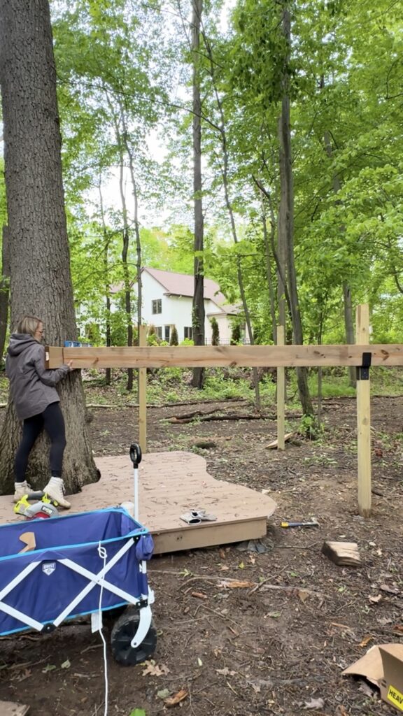 This is the scariest part… like no pressure but if this isn’t built well enough to hold not only the weight of the treehouse but also withstand kids jumping and playing up here for years to come… then we’re in for a really scary disaster. ChatGPT was my literal lifesaver for this project. I asked every question I could think of to help make sure that this platform was structurally sound. The upper platform is supported by 3 posts that are cemented into the ground, and the fourth post is the tree. I used carriage bolts and Z brackets to connect the corners and added extra bracing on either side of each post and one across the corner for additional support. I built the frame and joists the same way as I did the lower platform, using 2×6 boards and securing with screws. To secure the platform to the tree, I used a TAB (treehouse attachment bolt) which is basically a giant bolt the goes into the tree with a large bracket that attaches to the joists underneath the deck and it allows the tree to grow and move while still being secure.