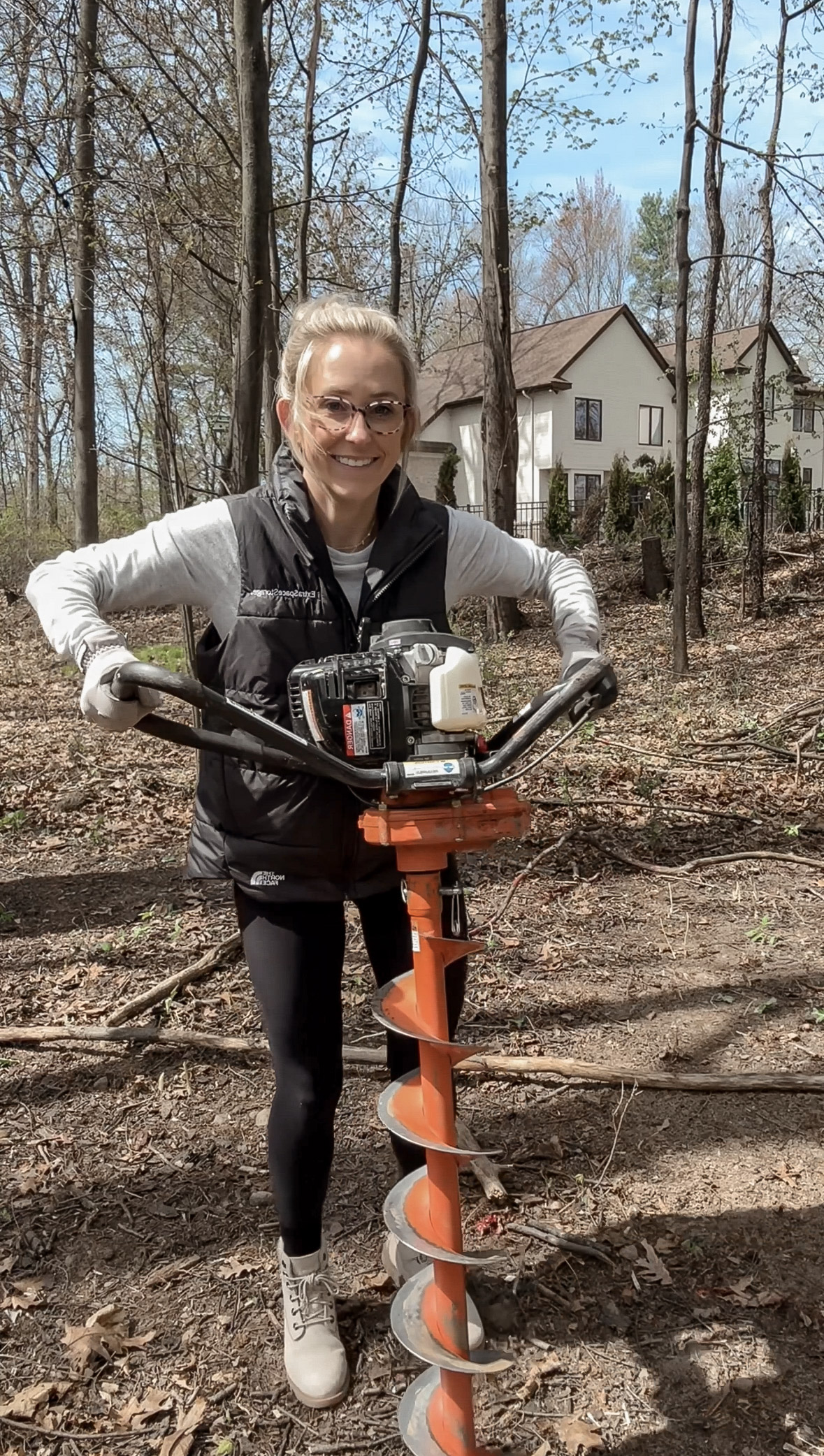 After mapping out where I wanted the platforms to lie around the trees, I rented an auger to start drilling holes for the posts. I had to ask my dad to come help, because that auger was kicking my butt– my shoulders may never recover. After the holes were dug, I used concrete to set the posts in the ground. This is the most important part, the whole treehouse is built off these posts so if they’re set incorrectly, the whole thing will fall apart.