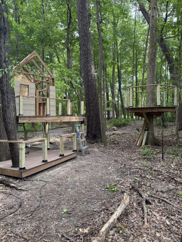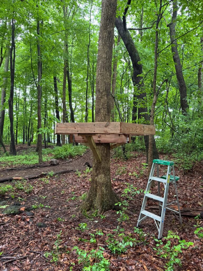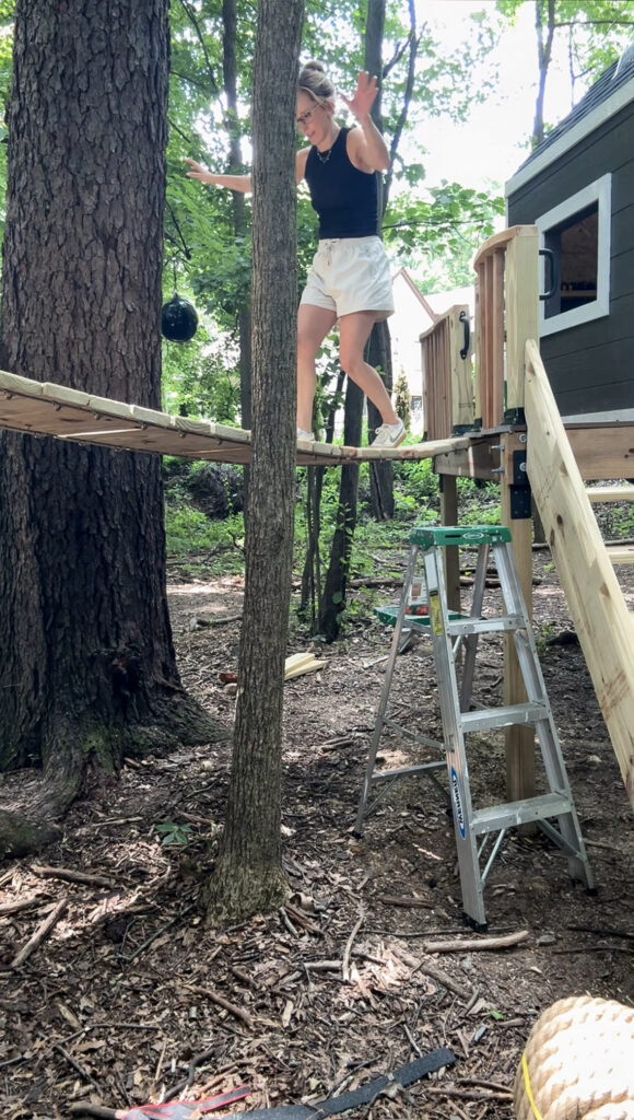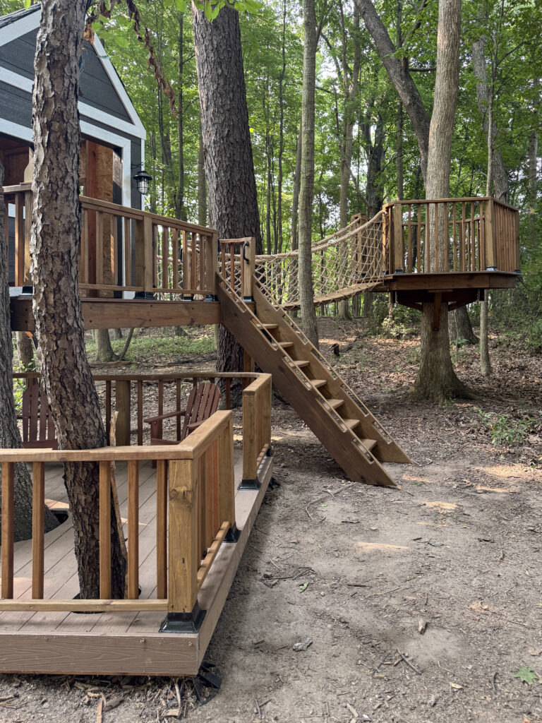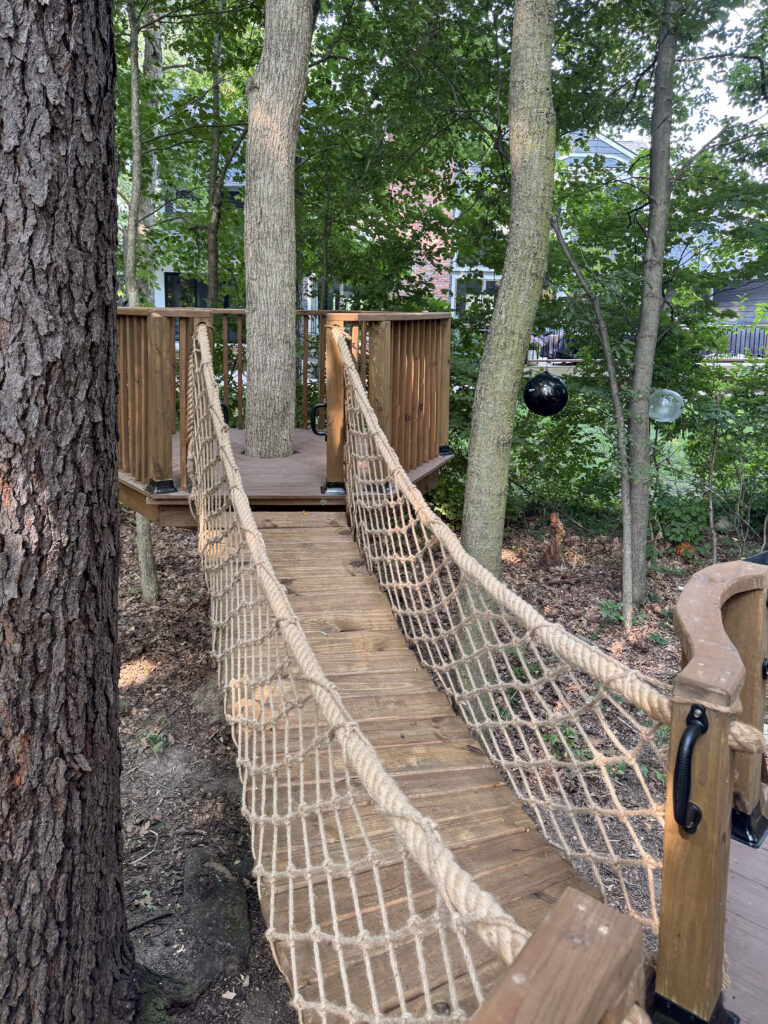 I wanted to build a lookout platform that is connected to the treehouse platform by a bridge. I asked ChatGPT to make me a cut list and building plans for an octagon shaped platform and then got to work. I used 2×6 boards and cut them at a 30 degree angle with my miter saw. I laid everything out in the garage to make sure it fit together, then brought it out to the treehouse to assemble. This is easily a 2-3 person job, but if you’re as hard headed as I am, you can do it by yourself by using a ladder as your extra hands lol.