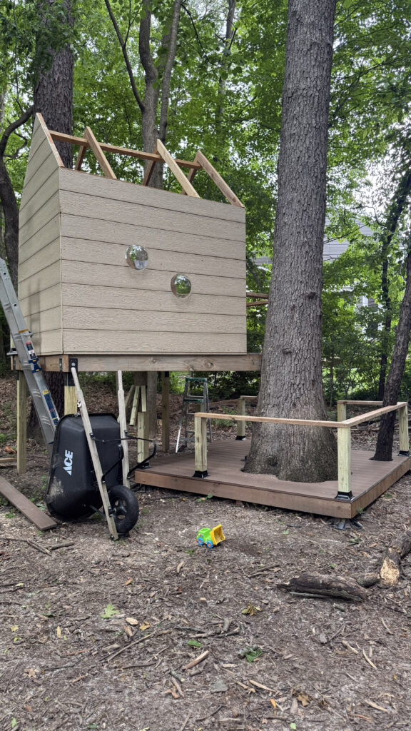 I recruited my husband TJ to help me put the cedar gap siding on the walls of the treehouse. After only a few dozen arguments, we got it done! I cut circular windows in the walls at each of the boys’ height so we will always remember how small they were when I built the treehouse.